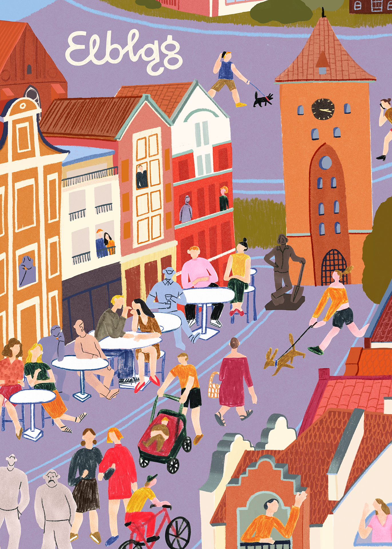 Elbląg series of posters&postcards Digital illustration Hand made Poster Illustrations commissioned by Sztuczki — a small design shop in Elbląg, my hometown in Poland. Created to celebrate and promote the city, these illustrations are featured on posters and postcards available for sale in the store. Client Sztuczki store Year 2025 Illustration Technic Mixed media